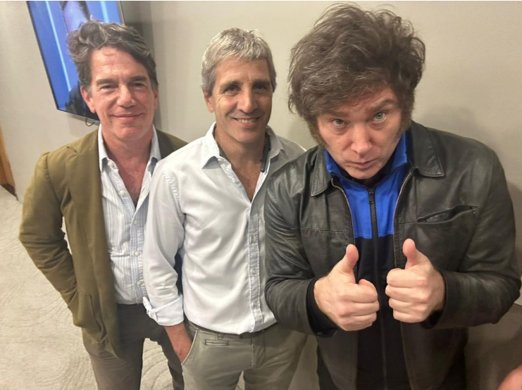 Alrededor de las 20.20, Milei subió a su cuenta de X (ex Twitter) una foto junto a Santiago Caputo -asesor de campaña- y Luis Caputo (asesor económico) indicando: "Rumbo a los Estados Unidos...!!! VIVA LA LIBERTAD CARAJO!".
