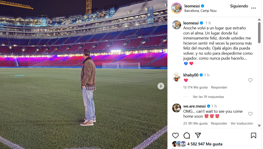 Leo Messi ha regresado al Camp Nou. Lo ha hecho a solas, en mitad de la noche. El astro argentino, que este lunes empieza con su selección una concentración en Alicante, visitó el estadio del Barcelona, tal y como ha mostrado en una publicación en sus redes sociales: "Anoche volví a un lugar que extraño con el alma. Un lugar donde fui inmensamente feliz, donde ustedes me hicieron sentir mil veces la persona más feliz del mundo. Ojalá algún día pueda volver, y no solo para despedirme como jugador, como nunca pude hacerlo...".