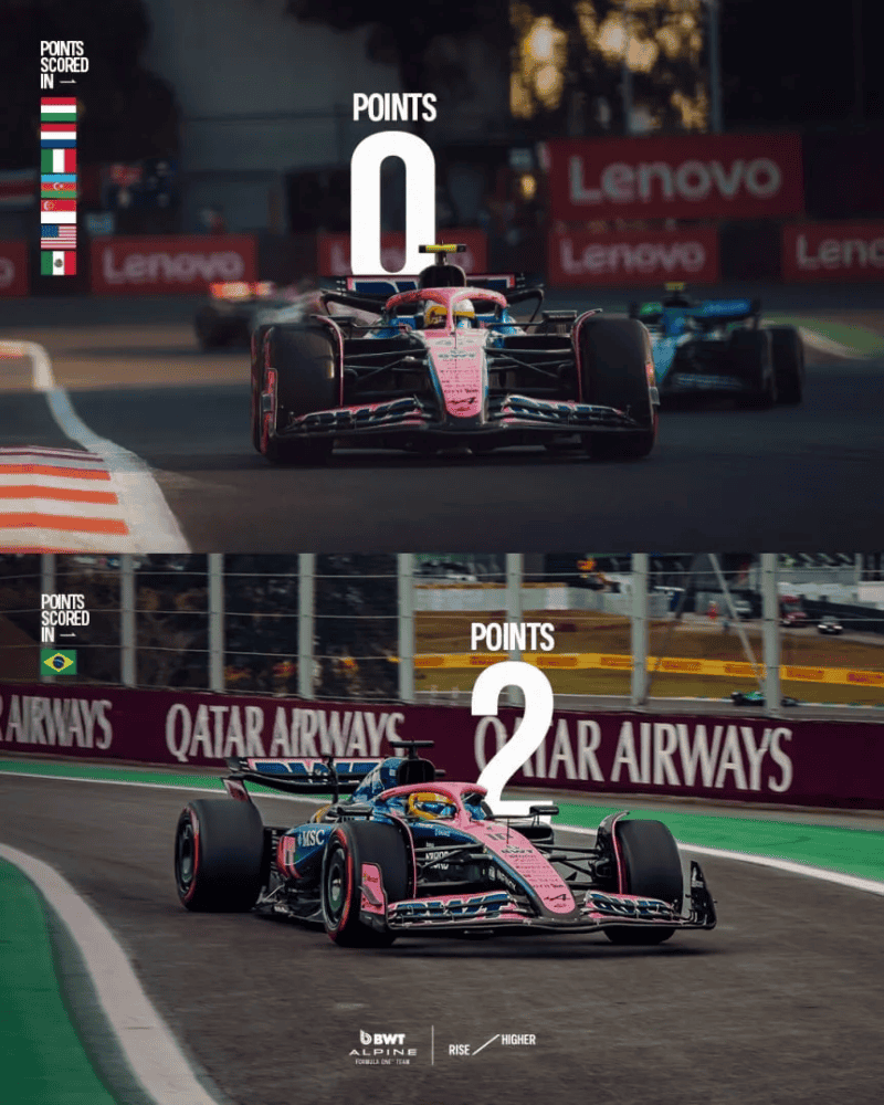 En lo que, partiendo de la base de la buena intención de la escudería, se trató de una clara equivocación comunicacional, la imagen que desató la furia de los argentinos mostraba el coche del pilarense en plena carrera con una enorme inscripción de "0 puntos" y, debajo, el auto de su compañero Pierre Gasly con la inscripción "2 puntoAcertadamente, todos lo tomaron como una absurda comparación de lo sucedido en Interlagos, y pocos notaron que muy pequeño a la izquierda apenas se leía "puntos anotados en" y una serie de banderas tamaño emoji representando los grandes premios sin porotos sumados por el equipo. En la imagen de Gasly, colocaron la de Brasil, donde logró los dos puntos aludidos. El texto que acompañaba a la imagen rezaba: “Paso a paso. Aunque nuestro objetivo es 2026, no nos rendimos. Un pequeño botín de puntos para llevar de vuelta a la base y para las últimas tres fechas de la temporada”.