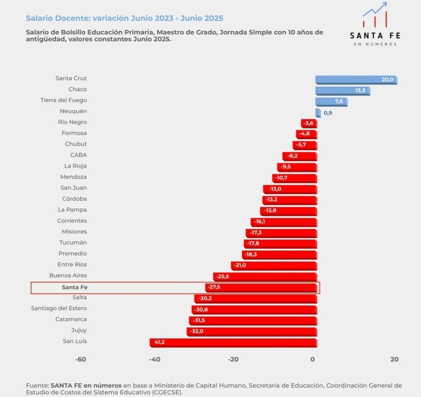 Una comparación de la evolución del salario docente en las provincias argentinas, permite observar que en la provincia de Santa Fe la caída para el período junio 2023-junio 2025 es de 27.5% en términos reales.