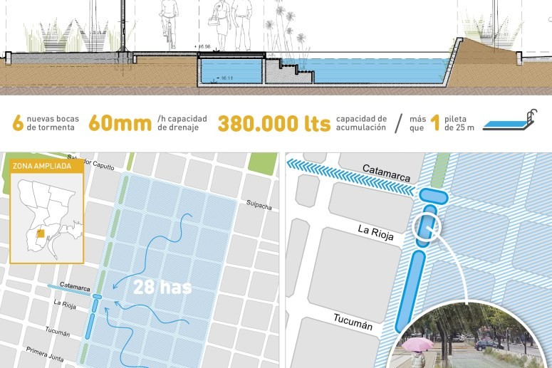 Todo el sistema está calculado según lo normado en la ordenanza 11959 sobre retardadores pluviales, que determina para el cálculo de estos contenedores tomar como referencia una lluvia de 60 mm/hora, considerada una lluvia fuerte. Según el Informe de lluvias, el pasado lunes la red de estaciones meteorológicas del Gobierno de la Ciudad registraron los siguientes registros pluviométricos: en el Palacio Municipal 61,25 mm; en Alto Verde 55,00 mm; en el CIC de Facundo Zuviría 62,75 mm y en el Hospital de Niños 55,75 mm. La intensidad máxima de lluvia fue de 69 mm/h y se produjo a las 2.45 horas.
