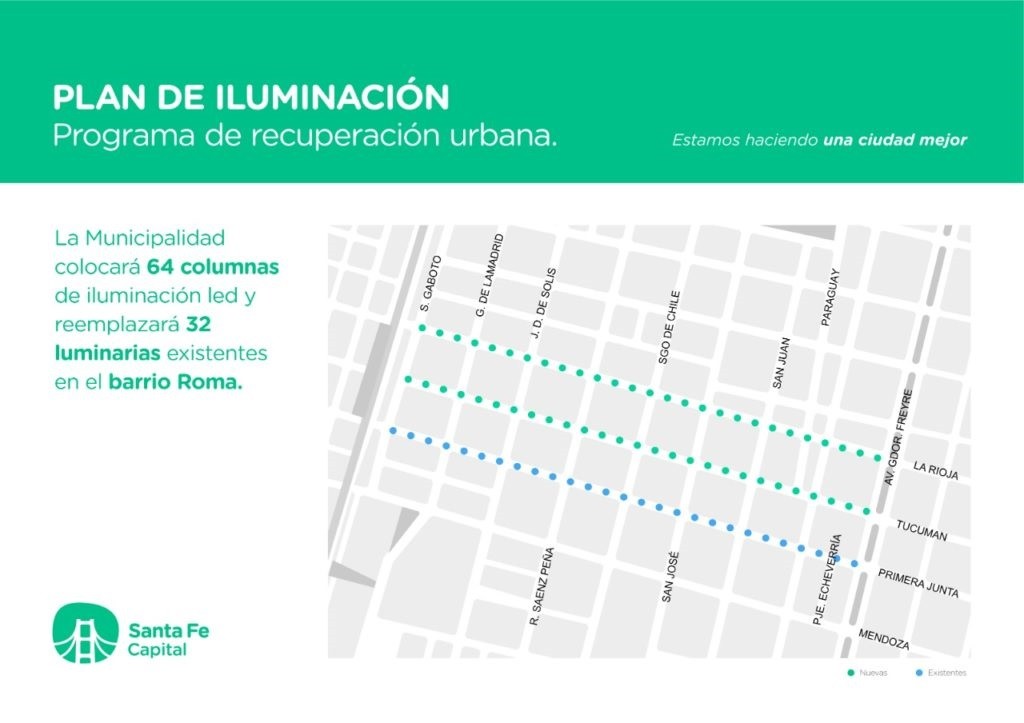 La obra comprende la colocación de 141 nuevas columnas metálicas con artefactos led, de las cuales 77 corresponden a Fomento 9 de Julio, y las 64 restantes a barrio Roma, donde se prevé además el recambio de 32 artefactos de sodio por led en columnas ya existentes. Asimismo, incluye la incorporación de tres tableros de comando nuevos. El presupuesto oficial de los trabajos es de 19.406.391,34 de pesos.