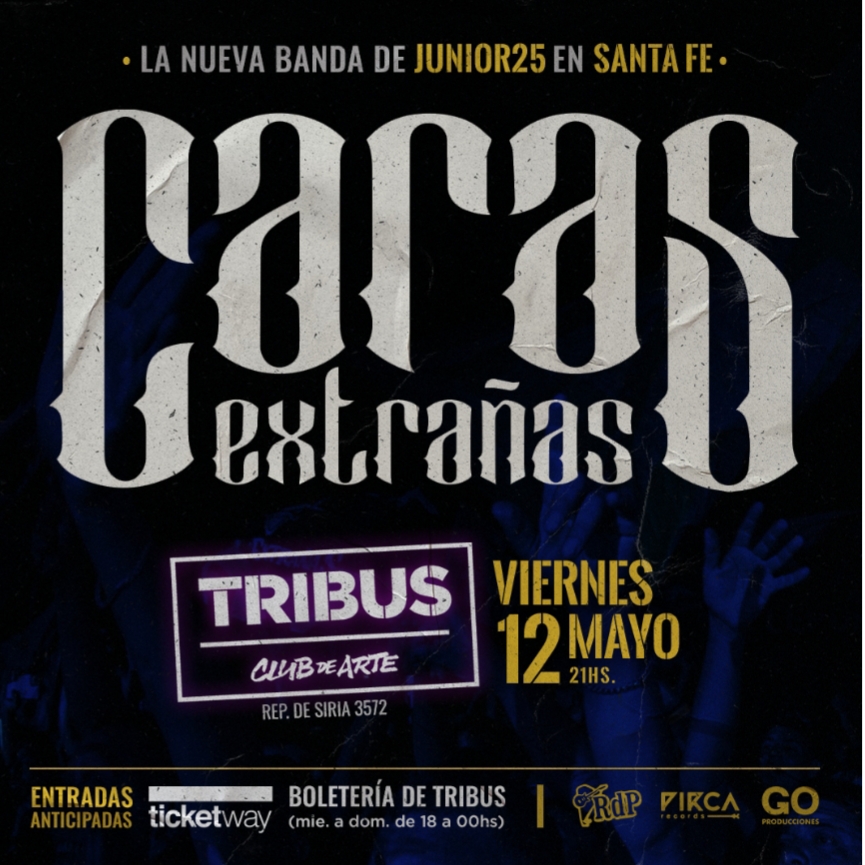 Caras Extrañas se presentará en Tribus Club de Arte el viernes 12 de mayo a las 21 hs. Las entradas están a la venta en la boletería de Tribus (miércoles a domingo de 18 a 00 hs) y a través del sistema Ticketway y sus puntos de venta (online y físicos)