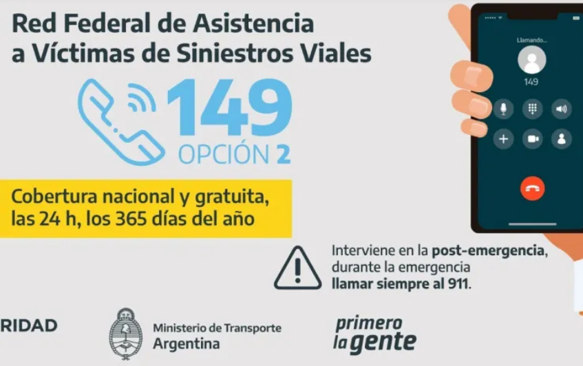 La línea de atención telefónica 149 opción 2 es un servicio gratuito destinado a la asistencia de las víctimas de siniestros viales y a sus familias. Pertenece a la Agencia Nacional de Seguridad Vial (ANSV)-organismo del Ministerio de Transporte- y busca cubrir las necesidades que pueden surgir ante un siniestro vial.