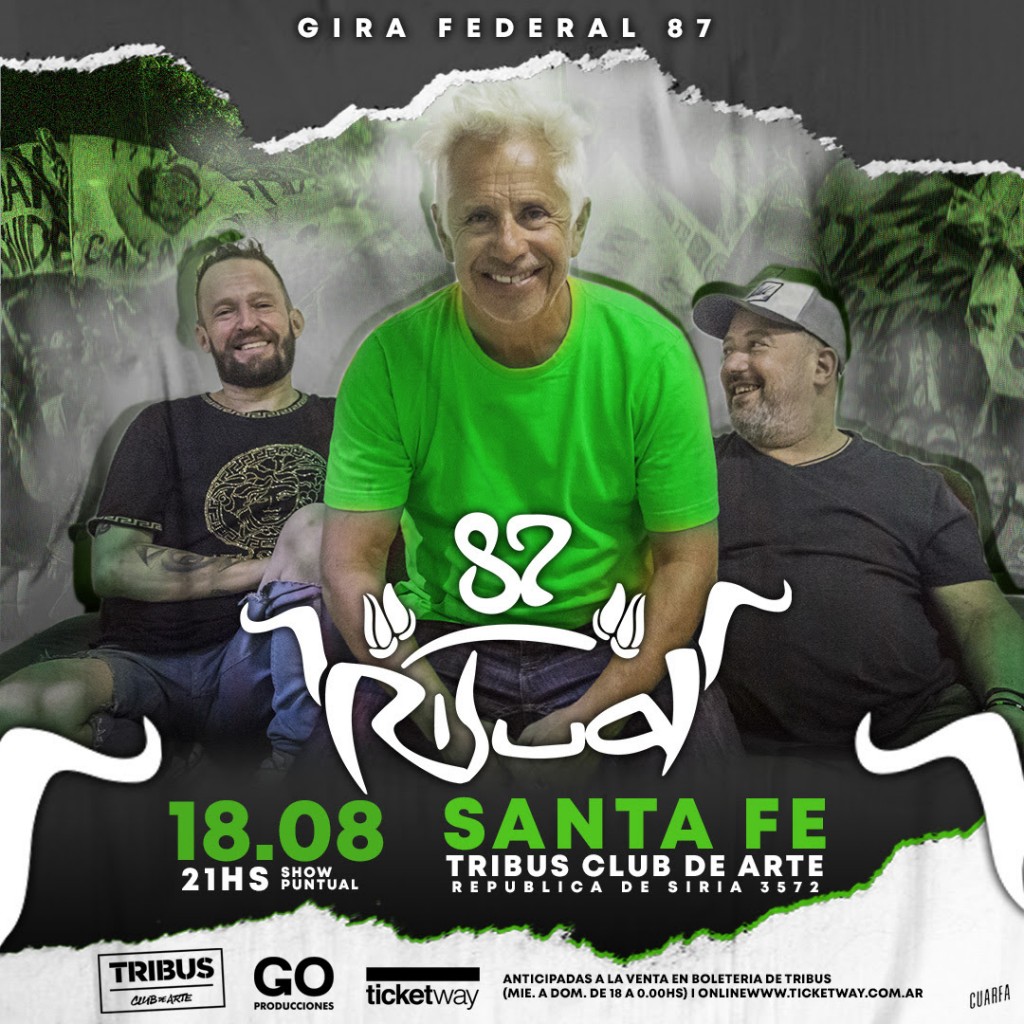Ritual 87 se presentará en Tribus Club de Arte el viernes 18 de agosto a las 21 hs. Las entradas están a la venta en la boletería de Tribus (miércoles a domingo de 18 a 00 hs) y a través del sistema Ticketway y sus puntos de venta (online y físicos)