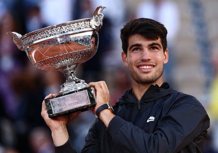 [FOTO: El español Carlos Alcaraz, con el trofeo obtenido en París.]