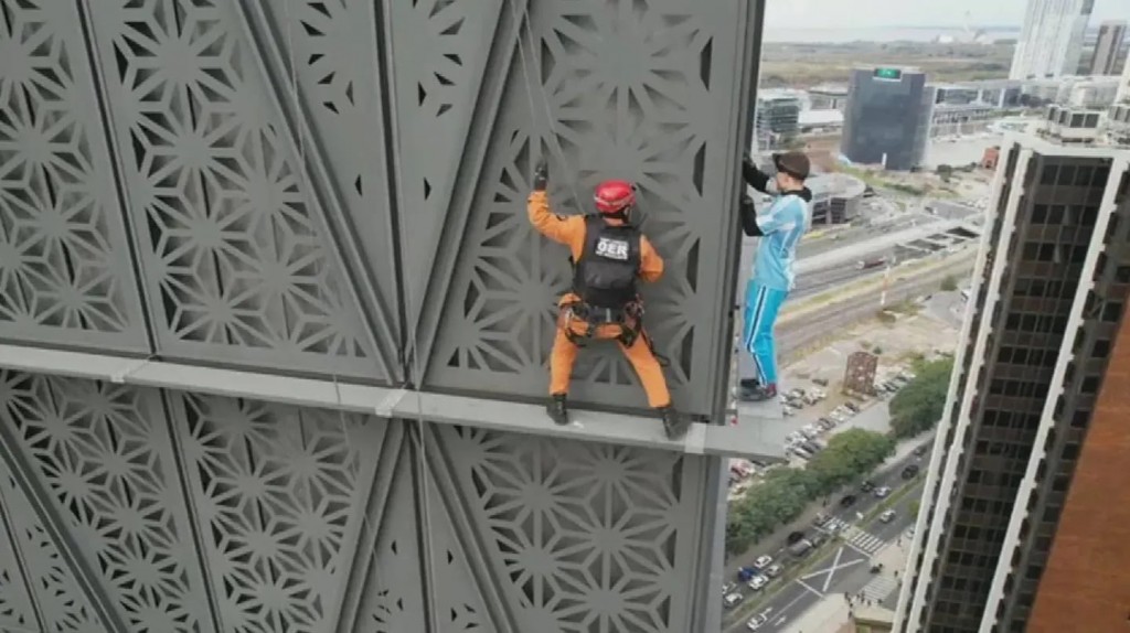 El hombre, de 36 años, identificado como Marcin Banot, vestía una camiseta de la selección argentina con el número 10 de Lionel Messi. Llegó hasta el piso 20 de la estructura, cuando los bomberos le colocaron un arnés e iniciaron su rescate y posterior detención.