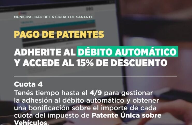 Quienes hagan su adhesión al débito automático para realizar el pago del impuesto de la Patente Única sobre Vehículos, tendrán tiempo hasta el 4 de septiembre para recibir un descuento del 15% para el pago de la cuota 4.