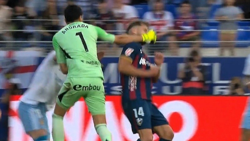 Lejos de acatar la decisión arbitral y retirarse al vestuario, Andrada —quien ya estaba amonestado por protestas previas— perdió los estribos. Apenas vio la tarjeta roja, el arquero salió corriendo en busca de Jorge Pulido, capitán del Huesca, y le propinó un fuerte puñetazo en el rostro.
